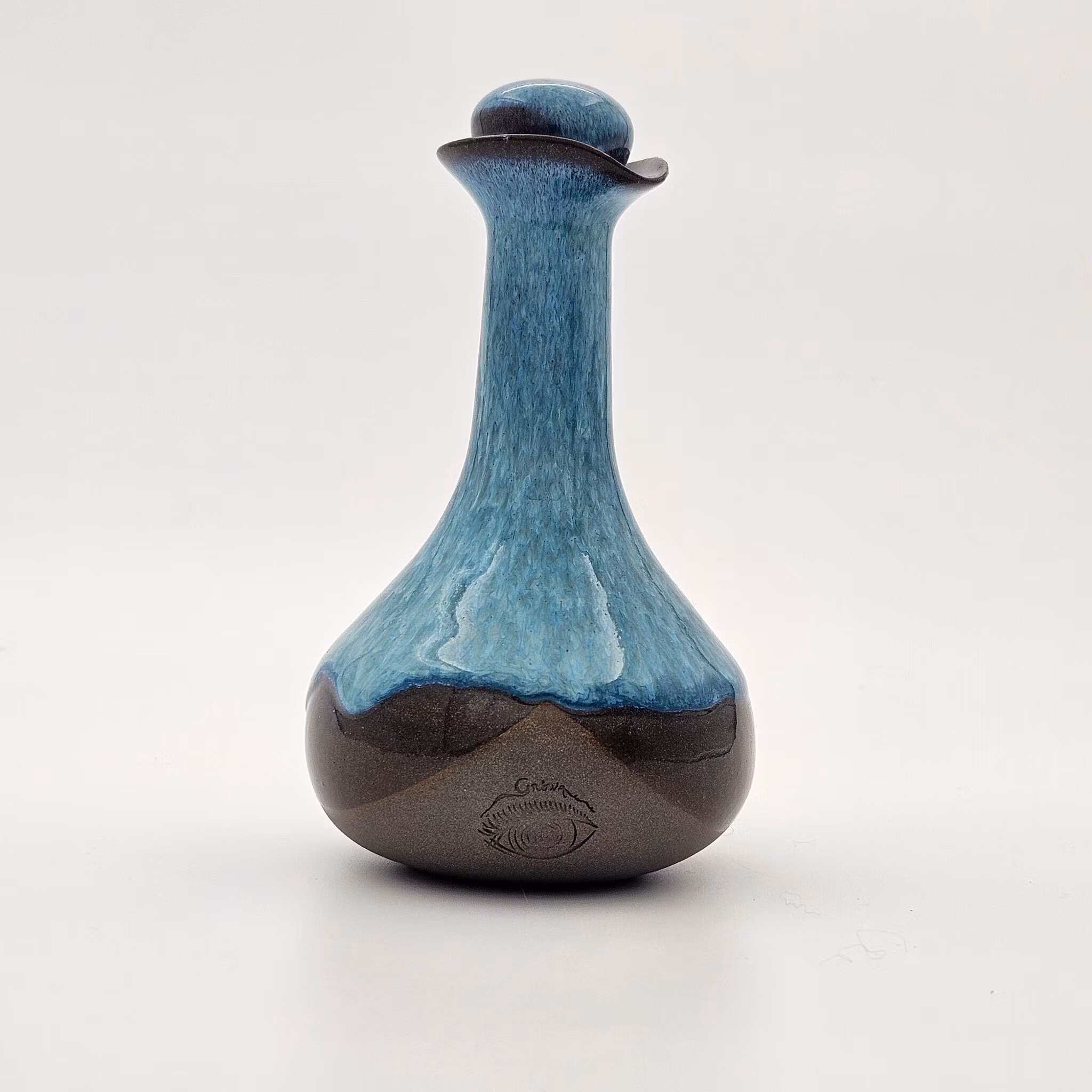 Oljeflaska, 15 cm, Blågrön 400:- I lager Lägg i korgen Produktbeskrivning Finns endast i ett exemplar. Höjd: ca 15 cmStörsta bredd: ca 8 cmKan diskas i maskin.