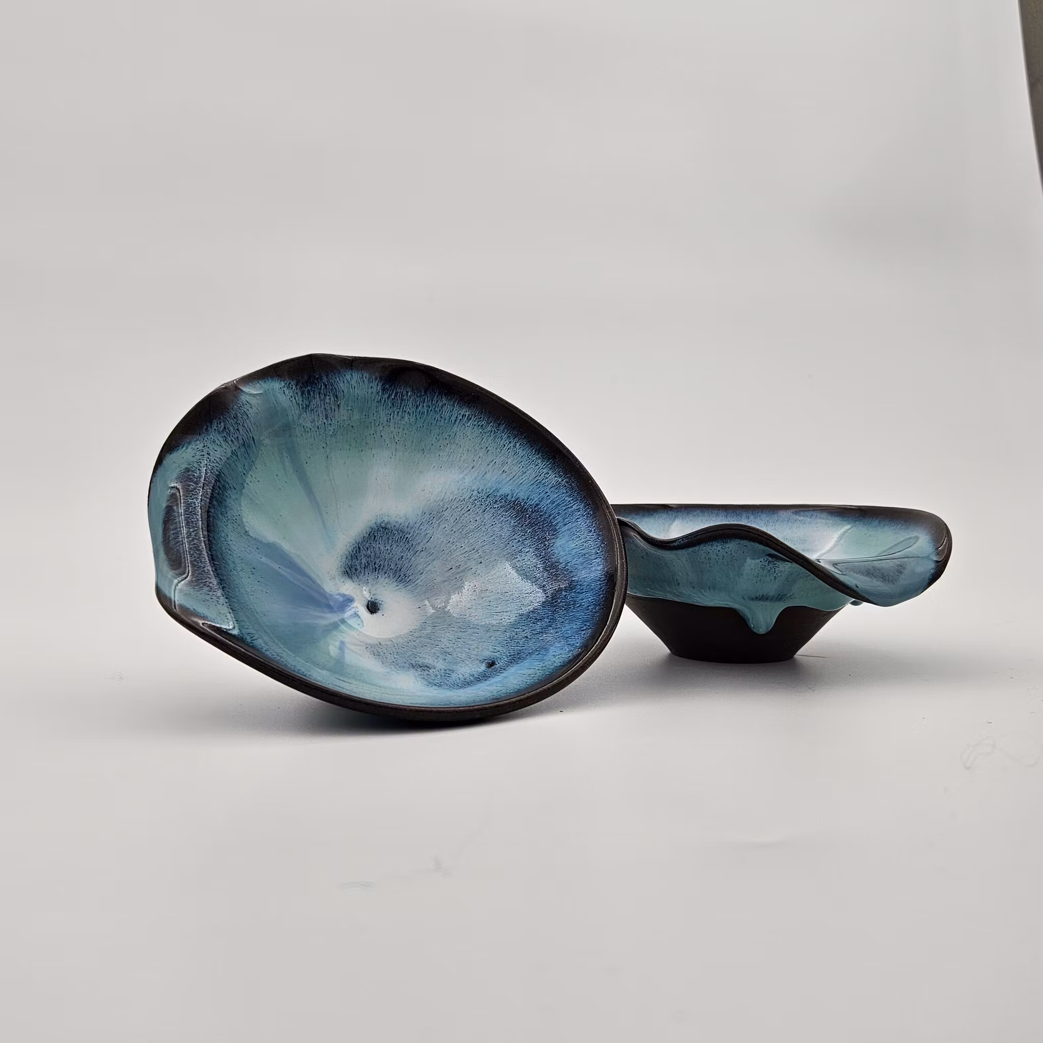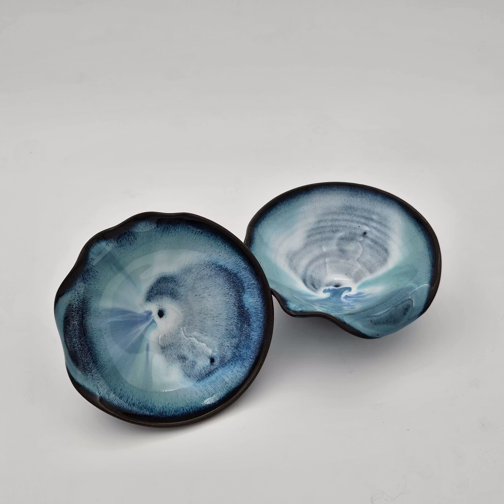 Uppläggningsskål Våg, 13 cm, Turkos-Vit 250:- I lager Lägg i korgen Produktbeskrivning Tillhör Våg-serien.Höjd: ca 5,5 cmStörsta bredd: ca 13 cmHanddiskas helst.