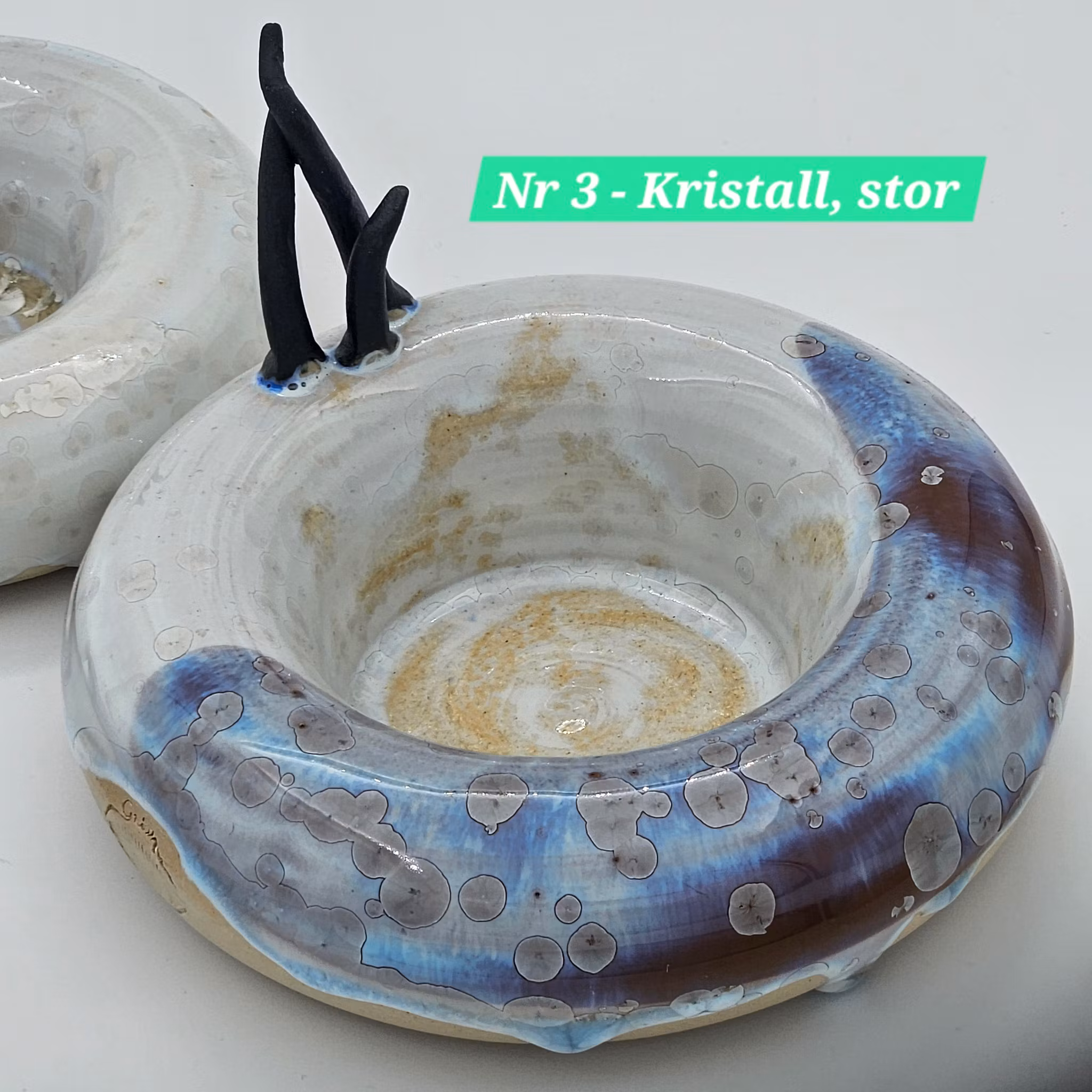 I Liten passar små värmeljus och i Stor både små och stora. Fungerar också jättebra som små skålar eller uppläggningsfat. Faten har olika färger under glasyren vilket ger olika färger på kristallerna.