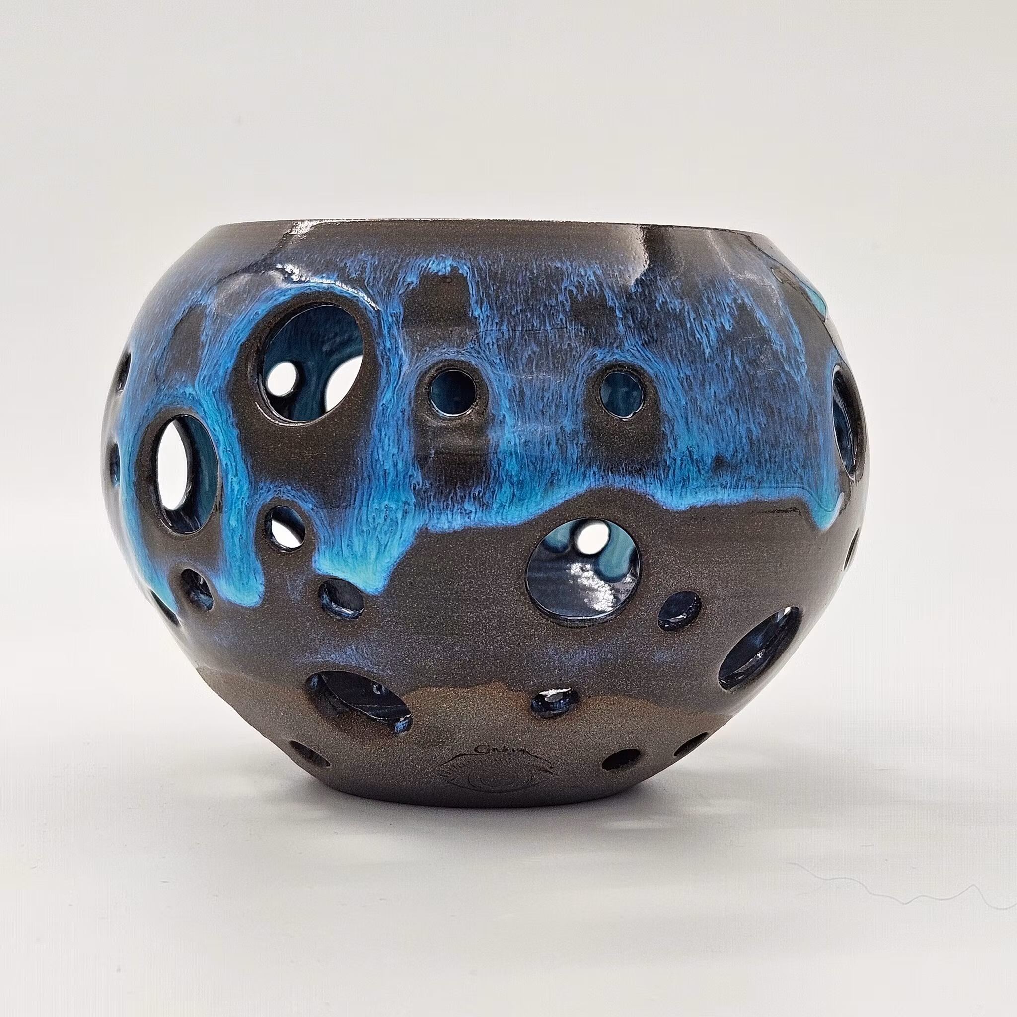 Ljuslykta Mellan, 10 cm, Turkos på svart lera 400:- Produkten är tyvärr slut i lager. :( Produktbeskrivning Passar för stora och små värmeljus. Höjd: ca 10 cmStörsta bredd: ca 13 cm