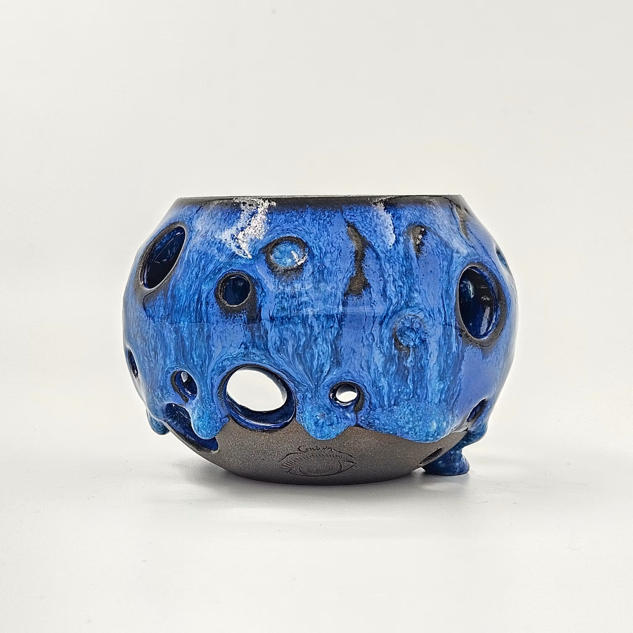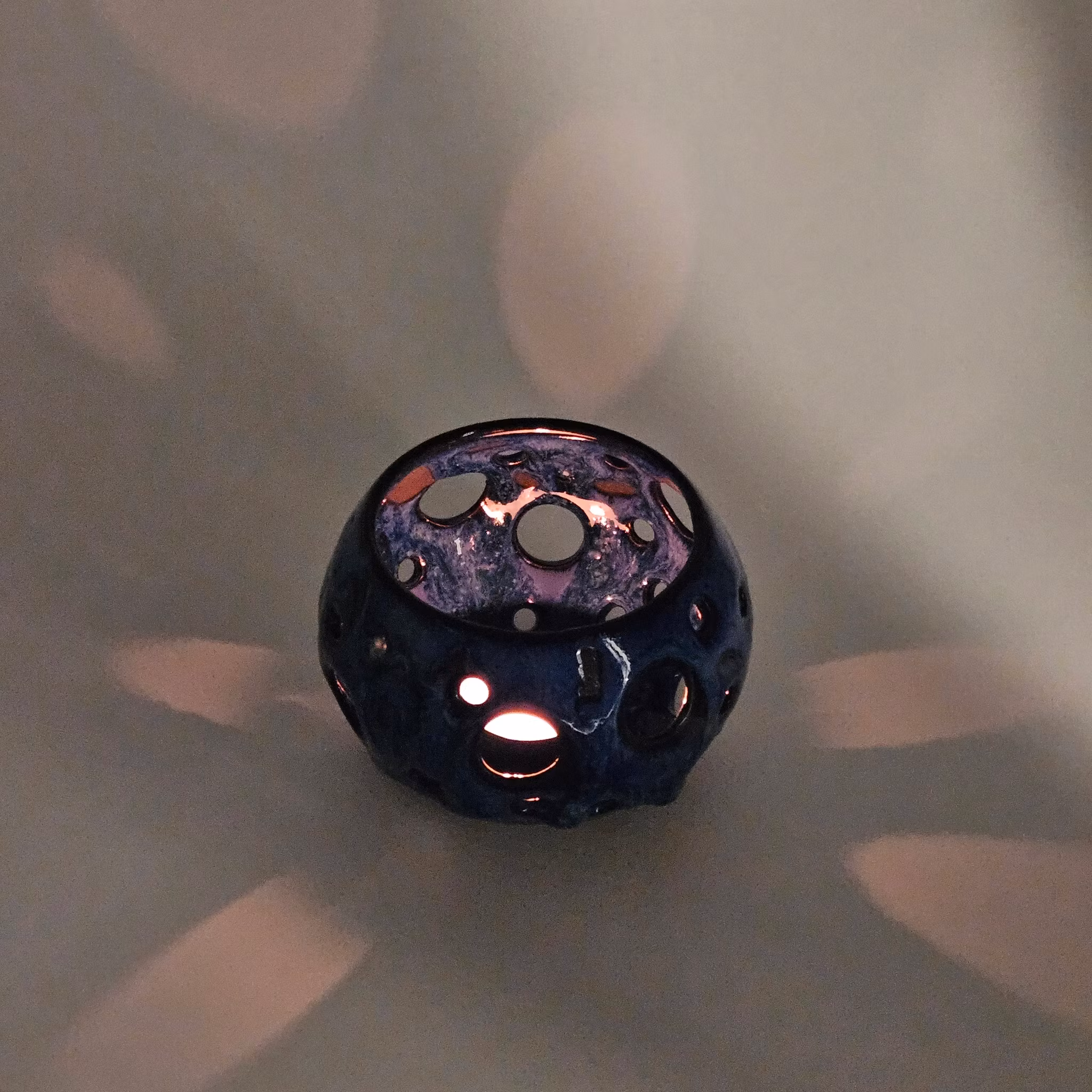 Ljuslykta Liten, 8 cm, Blå på svart lera 300:- I lager Lägg i korgen Produktbeskrivning Passar för stora och små värmeljus. Höjd: ca 8 cmStörsta bredd: ca 11 cm