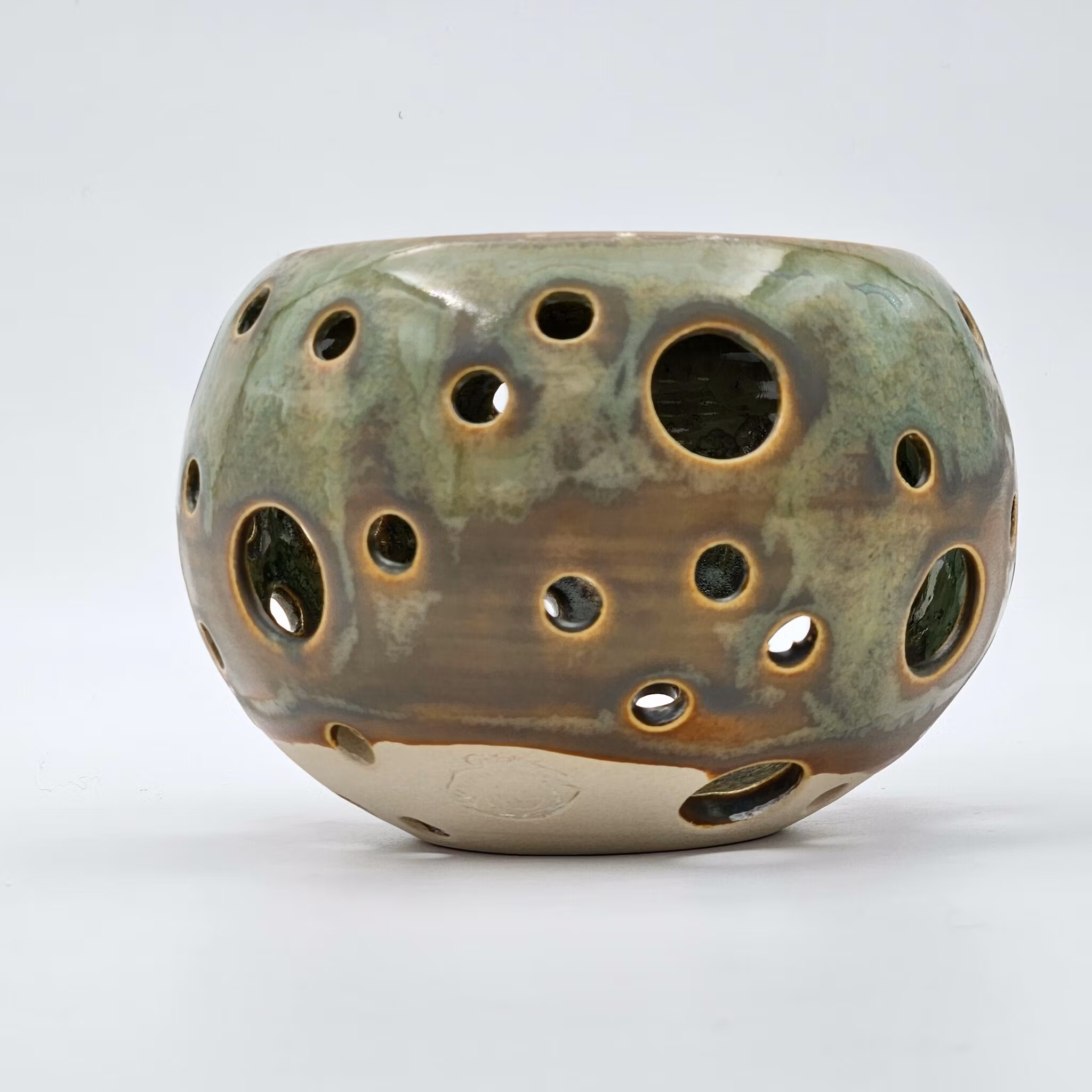 Ljuslykta Mellan, Koppar-järn Kristall på vit lera 500:- Produkten är tyvärr slut i lager. :( Produktbeskrivning Passar för stora och små värmeljus. Höjd: ca 9 cmStörsta bredd: ca 13 cm