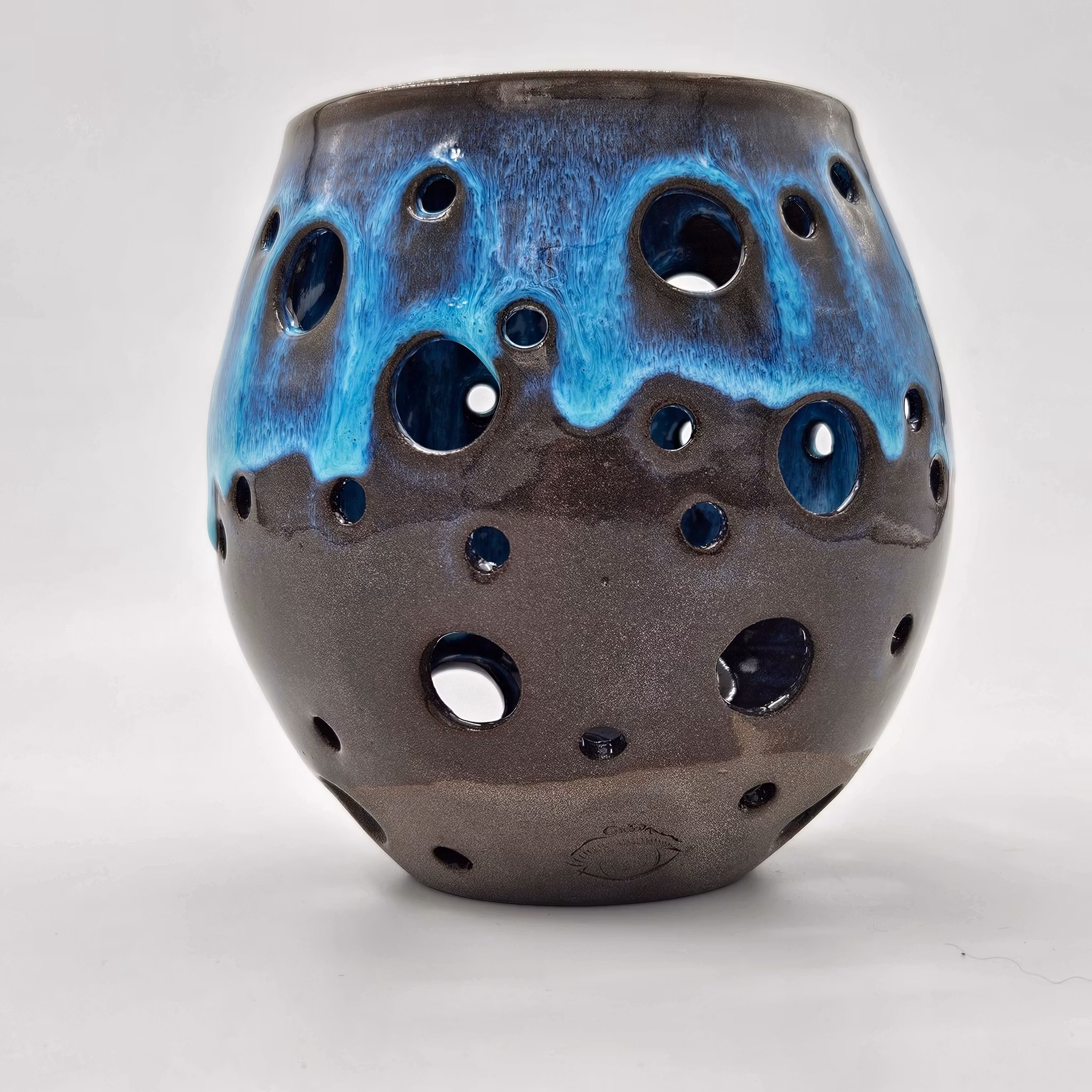 Ljuslykta Stor, 15 cm, Turkos på svart lera 500:- Produkten är tyvärr slut i lager. :( Produktbeskrivning Passar för stora och små värmeljus. Höjd: ca 15 cmStörsta bredd: ca 14,5 cm